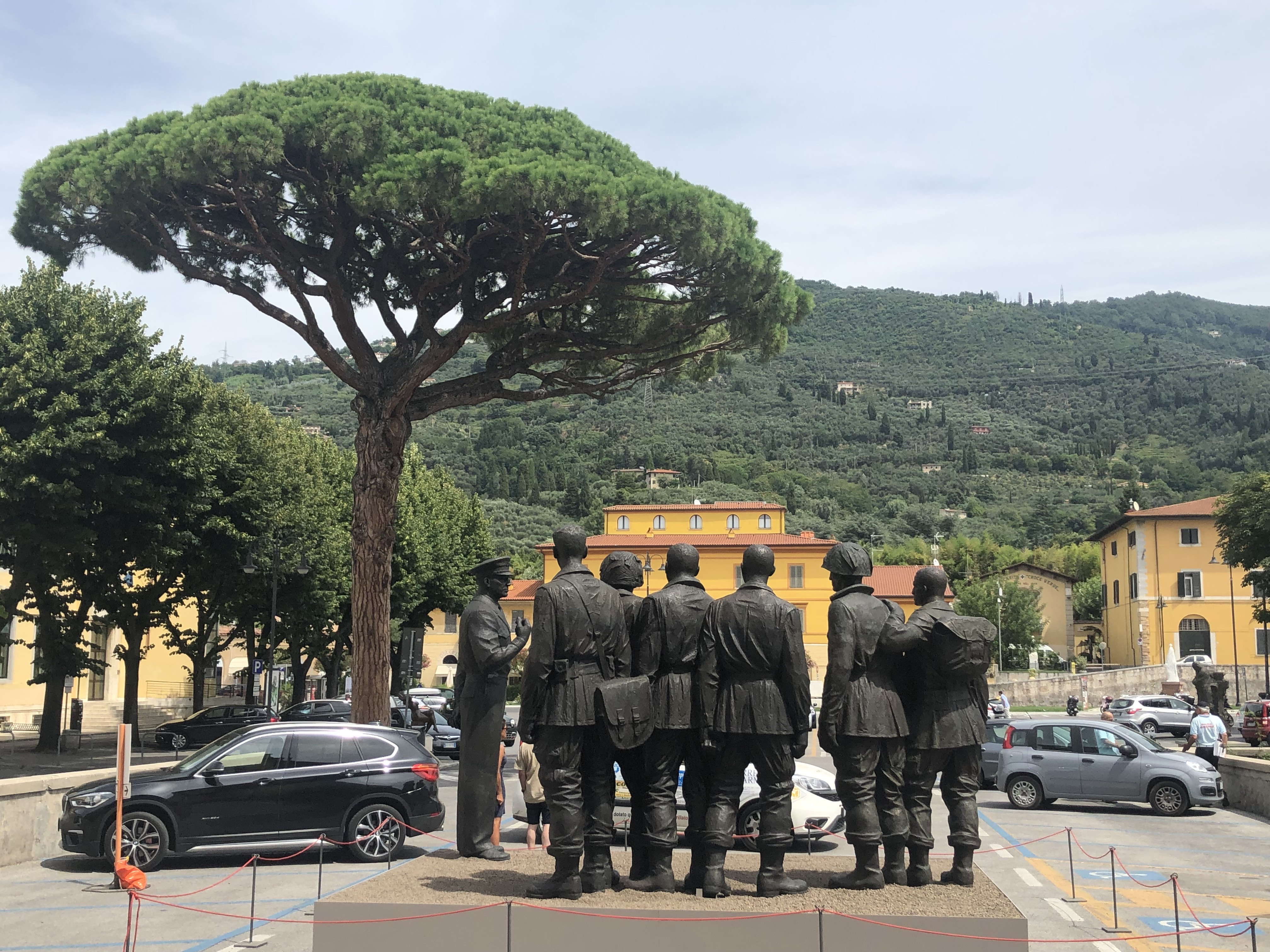 This part of the Memorial sculpture shows general Eisenhower (far left) addressing six paratroopers from the 101st Airborne Division outside the town hall, Pietrasanta, August 2019