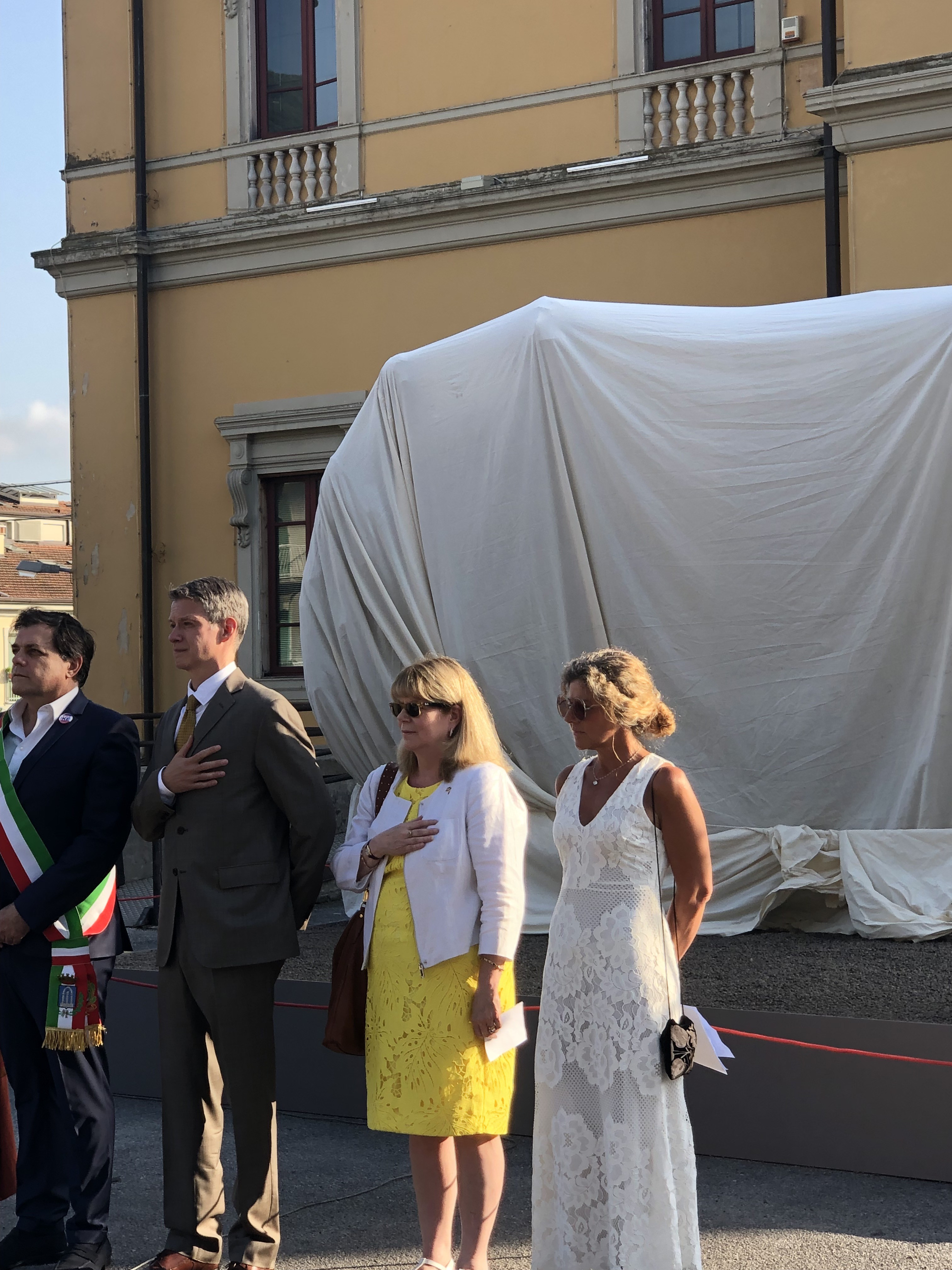 American and Italian dignitaries sing the Italian and American national anthems at the unveiling of the sculptures