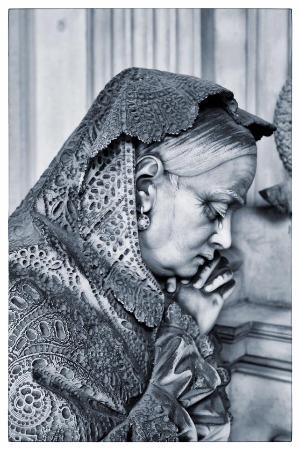 Just one of many detailed funerary statuary to be found amid tombs within the Staglieno Cemetery, here is a detail from the tomb of Giuseppe Benedetto Badaracco by Giacomo Moreno (circa 1832–1910). The carving shows the kneeling figure of a mourning woman in a lace shawl, hands clasped to one cheek, head bent, brow furrowed, eyes shut, wrinkles in the corners, a single tear running down her nose – all picked out with exquisite precision and intricacy
