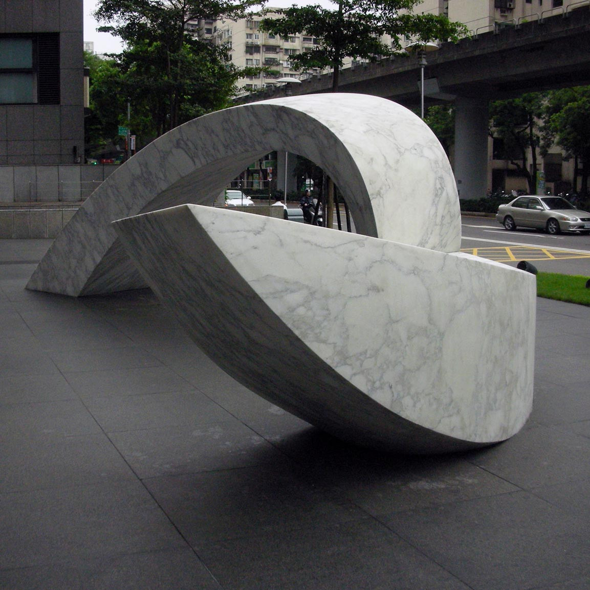 Cynthia Sah, Balance & Counterbalance, 2000, arabescato white marble, 2 × 7 × 2 m, Taipei, Taiwan