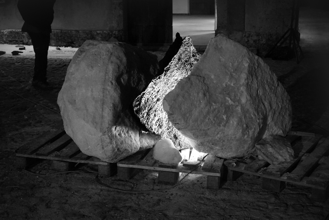 The first piece that Badriah made after her accident was PROLIFERATIO which consists of a block of two tons of salt, split in half and a cast of the rupture in black polyester. Where the pure and natural salt has opened up, the black synthetic proliferates out of its core, as if a tumour growing at the same speed as the mineral. It seems to suggest: 'At the moment of birth our death is born as well' which, Badriah says, is the only certainty we have. This work is currently in the collection of the Museum of Contemporary Art Sotto Sale, Sicily.