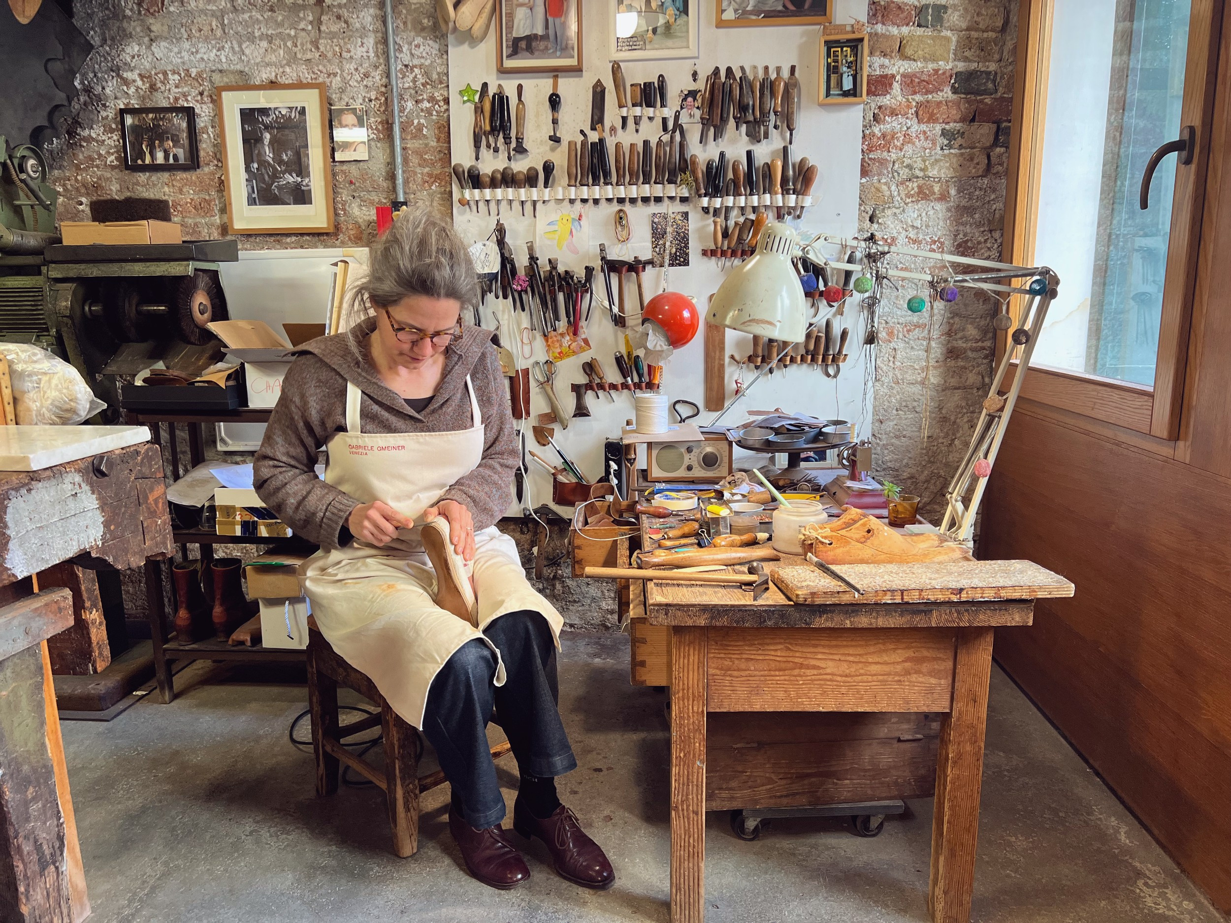 Gabriele studied at Cordwainers College in London, and in Paris at the Centre Formation Technologique Grégoire for saddlery. She honed her skills over ten years working throughout Europe before she came to Italy and made her home in Venice.