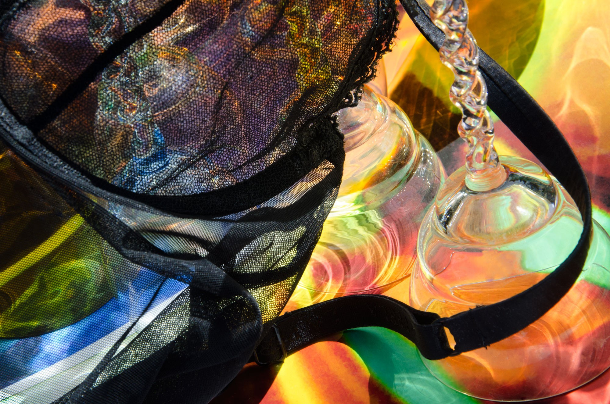 Janice Mehlman:And I started hanging them and moving them and getting in close to them and creating these compositions that really felt a lot like my guts, my innards, my inner soul, and somewhat sensual. And my mother recently passed away. And here we’re looking at a photograph that I did using one of my bras with some of the glassware that I had gotten from my mother’s estate and putting it together. And they’re very sensual and very seductive images. And that was the whole series I started, which was ten years ago, changed my whole way of looking at my work.