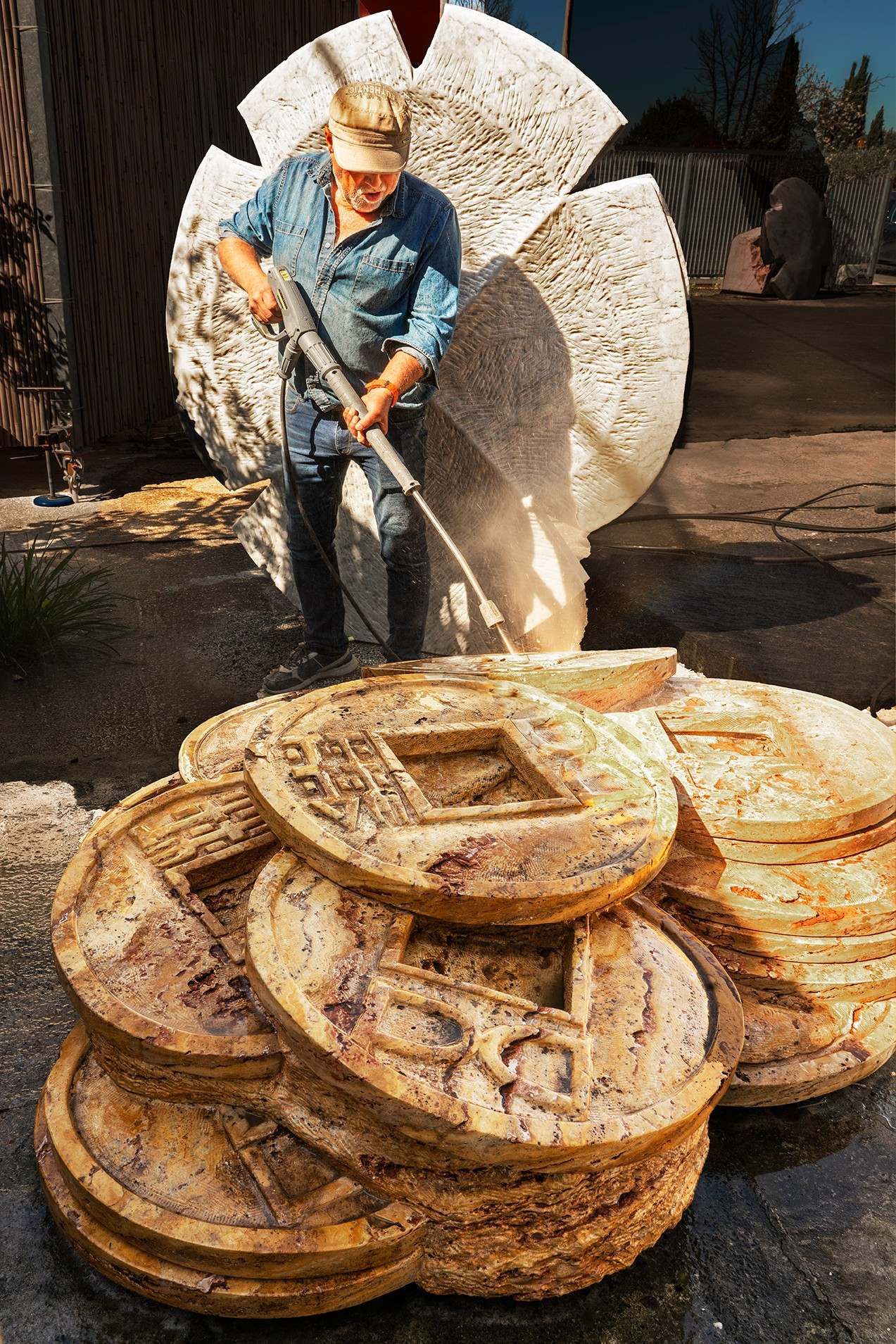 John Greer:And on a column, I want to do coins about three two to three feet based on antique coins falling out of the sky down to one on the bottom level that you could rub on your way to work for good luck, like the nose on the boar in Firenze. So this this piece here was a four ton rock. I was interested in China at this point because I think the invention of money and the history of money is very fascinating. I’ve done about a dozen money pieces or value pieces that refer to the money. This is a Wushu coin.