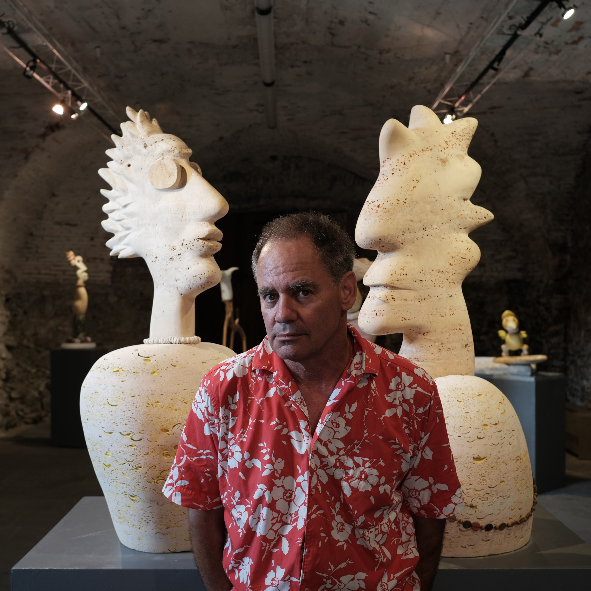 Sarah Monk:Inside the building, high windows throw light down on Neal’s space, packed with his personaggi or characters carved from brightly colored stone, some of them also painted. They’re already on plinths for his exhibition in a few days.
