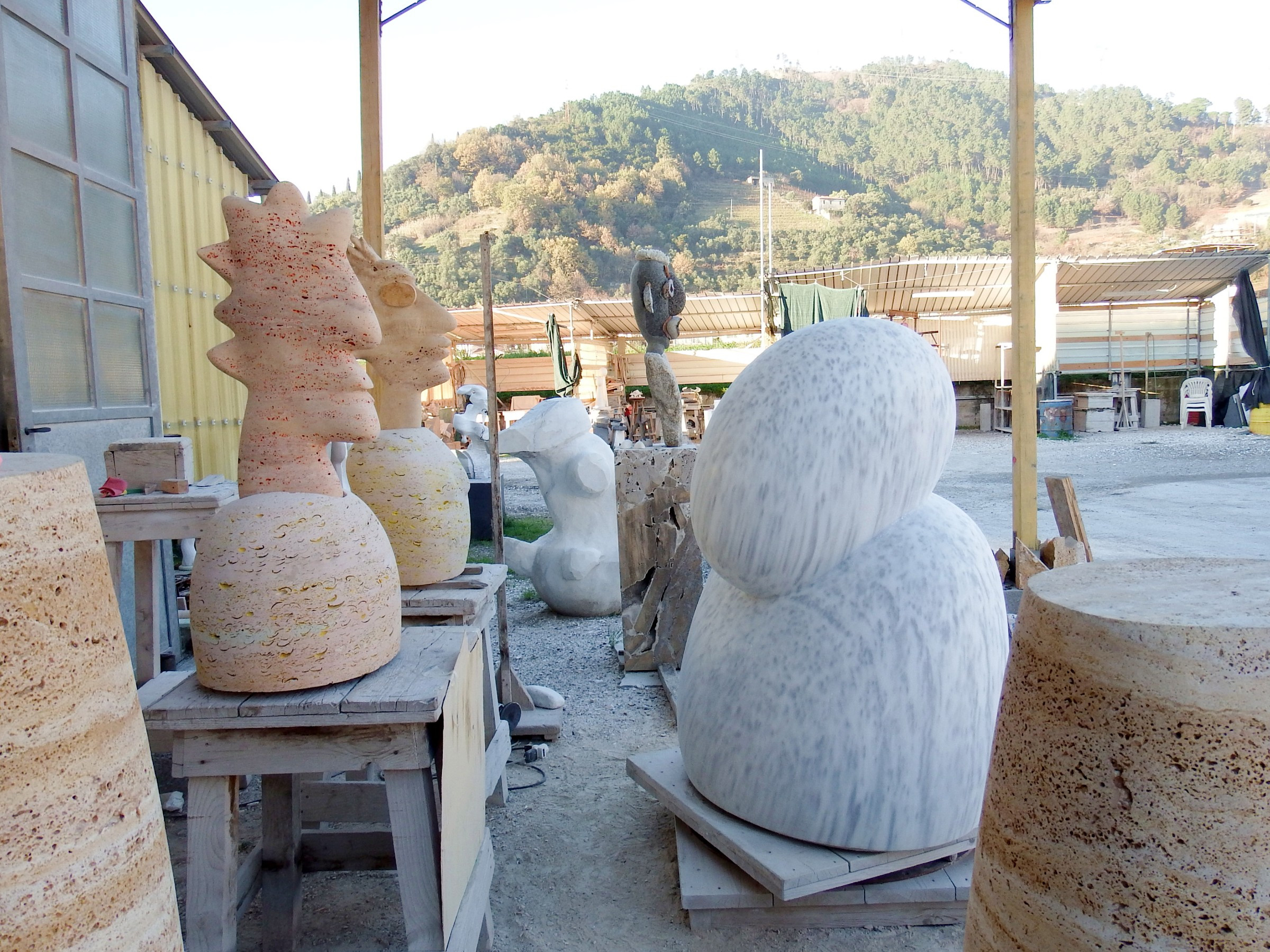 Sarah Monk:Pescarella has an enormous yard dotted with the equipment they share. Trucks with a long arm and sling to lift the stone, trolleys to move it around, compressors to power the tools and blow off the dust. Around the huge industrial building are outdoor workspaces with three sides of corrugated iron and a roof. I love the old wooden cavaletti or little horses on which the artists place their sculptures to work them. The older the cavaletti, the more they are scarred by cuts.