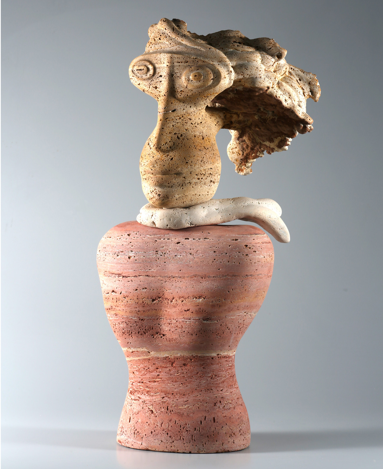 Neal Barab:What we’re looking at now is a head that’s maybe 10 kilos, but I probably bought two tons of stone. So this has yellow travertine. It has Roman travertine as a kind of scarf floating in the wind, and it has a red Persian travertine as a torso, and it doesn’t really need more color. Although, if you look very closely up in the hair, I did paint some red into the holes of the hair.