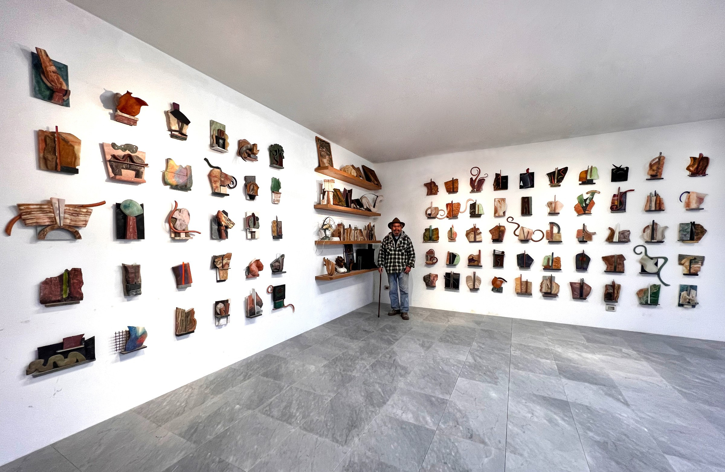 Ron Mehlman:We are currently in my Italian studio, which is cut into the hillside just above the town of Pietrasanta It also has a beautiful view of the Mediterranean. The property has enough woods around it, to have a sculpture park. And slowly, we have cleared away some land and have put some sculptures which seem to go into this place very beautifully. In my studio, on two large walls, is a wall relief composed of 80 smallish sculptures.