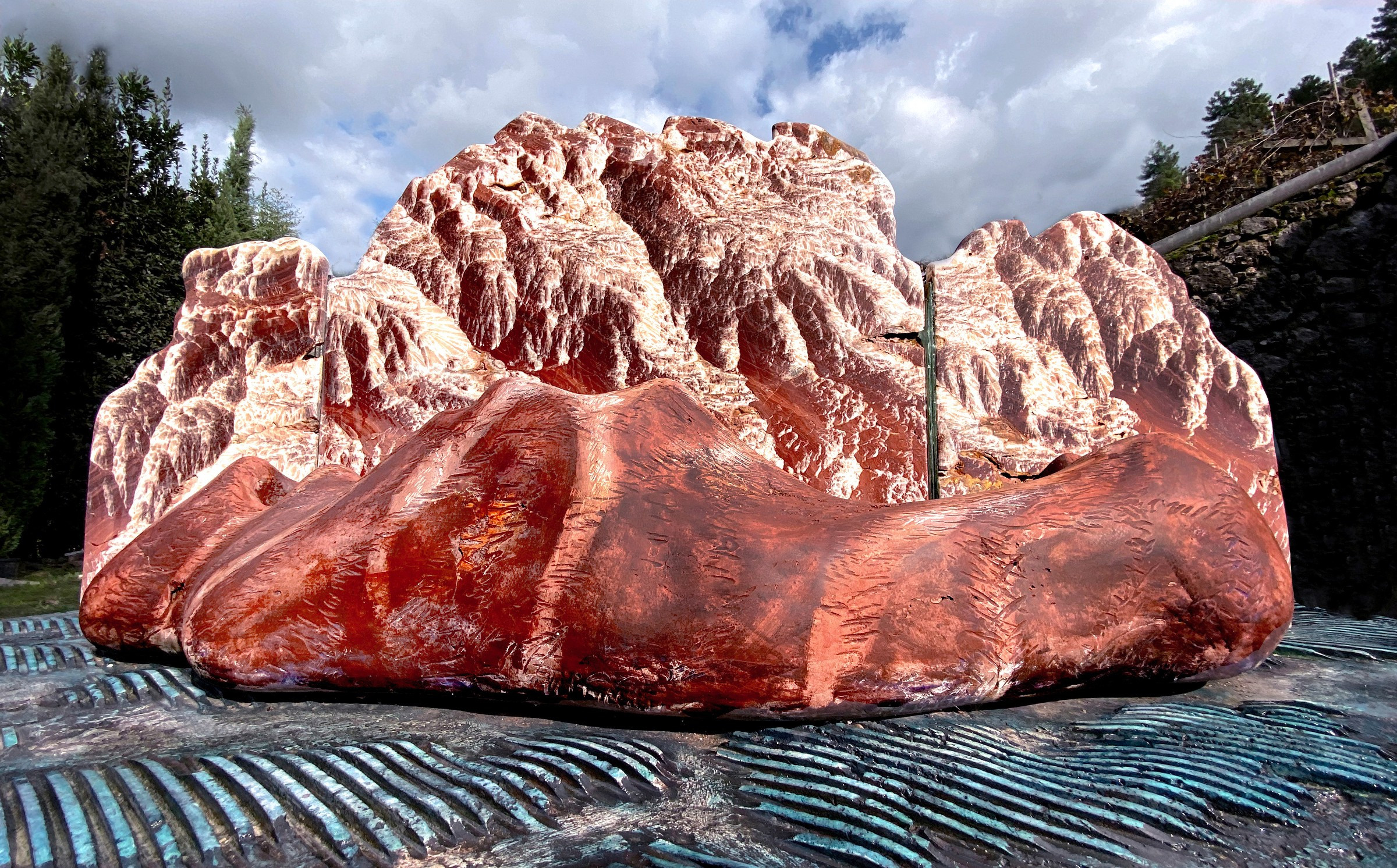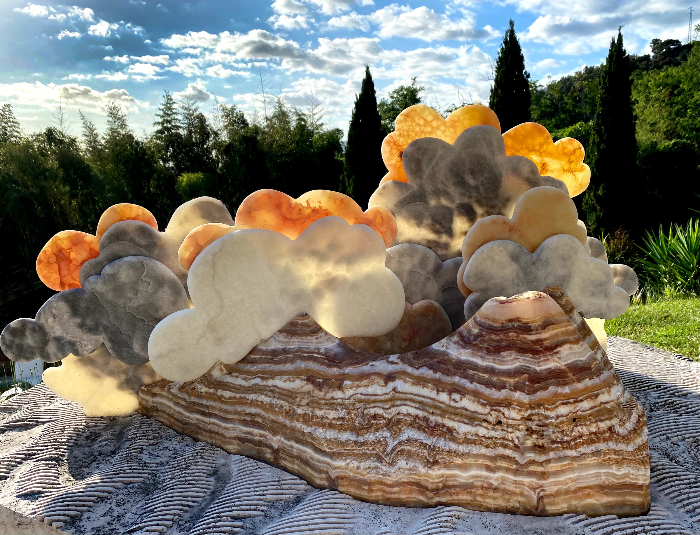 Ron Mehlman:I think I got the idea from just watching the sunsets from my property, from my hillside, and watching the various colors at various times of the year. If you look out over at the sunsets, there are some hills and mountains in the background. And it came to me that I could use that kind of feeling, using mountains to build a a base for a sculpture, and then using other stones like onyxes to give the feeling of lightness and clouds floating by the islands or the mountains.