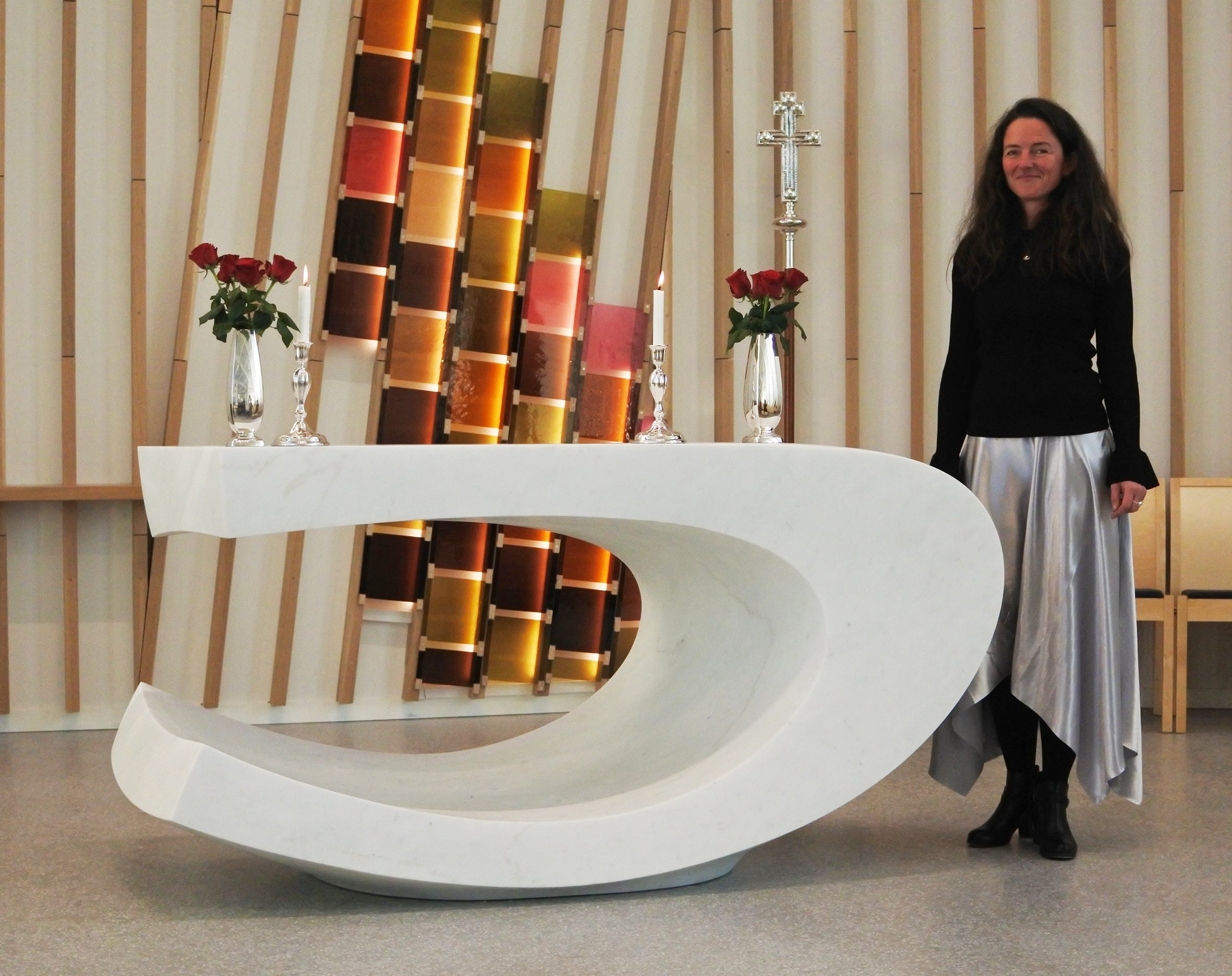 With abstract calligraphic lines, Julia Vance creates sculptural forms in white Italian Statuario marble. She tells us how she created a modern altar, font and pulpit for a new church in Hønefoss, Norway, which replaced the previous church which had burnt down.