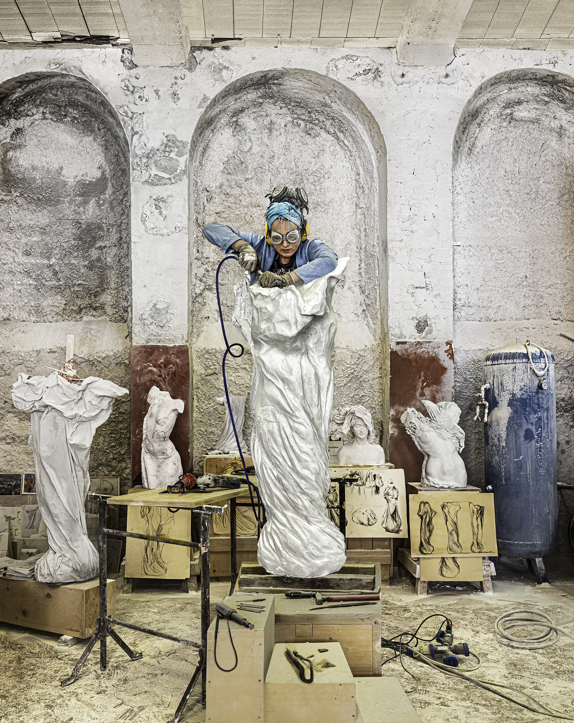 Sarah Monk:I followed Gail out on a photography trip and found Marianna standing on a table top in her large hangar like work shop in the centre of Carrara. Wearing goggles and earmuffs, she was bending down over the top of a tall sculpture and using a compressor powered tool to carve the final touches. Later, I met with her at her studio to talk in more depth. I asked her to introduce herself.