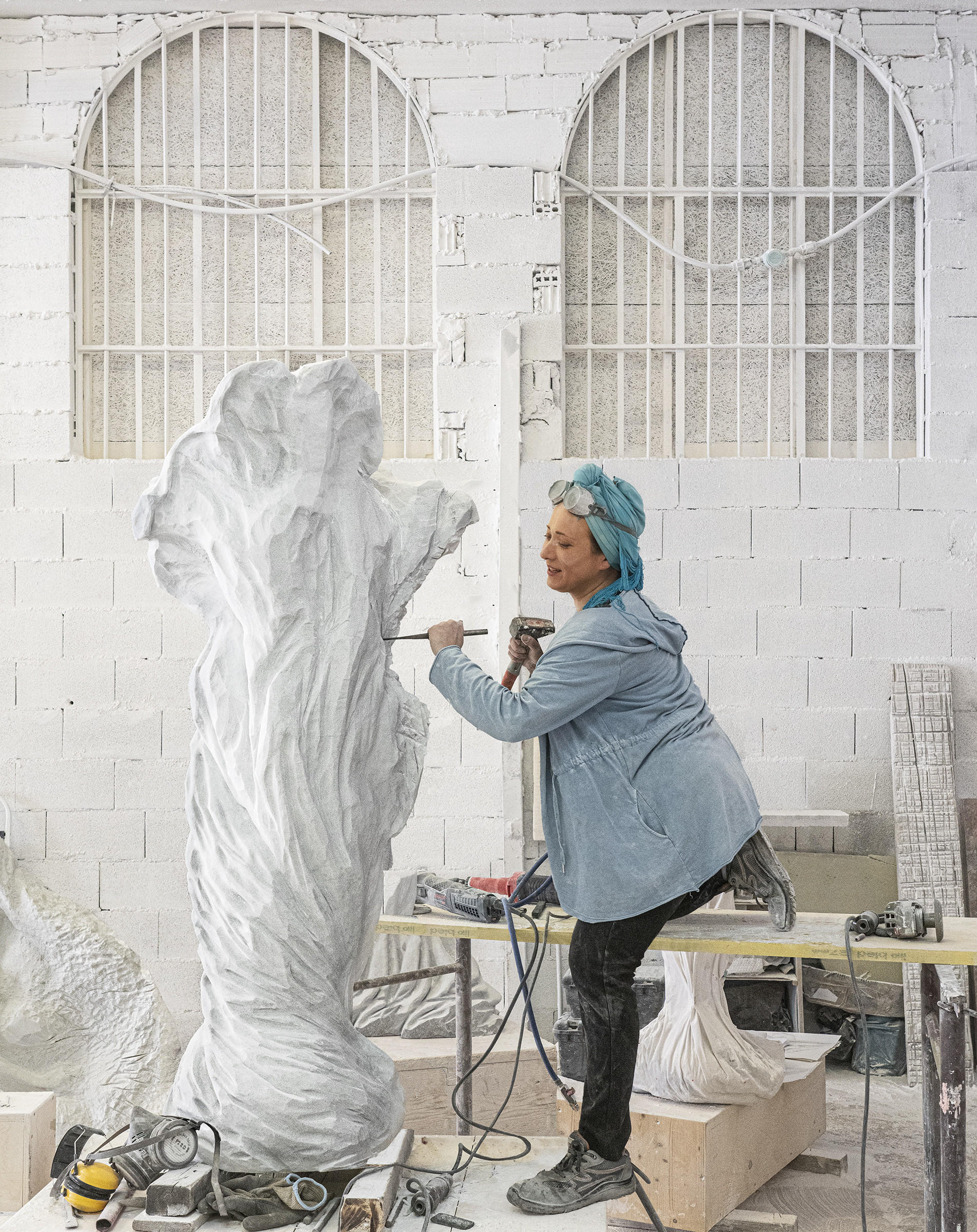 Eminent Californian photographer Gail Skoff introduced Marianna, and when I followed Gail on one of her photography trips, Marianna was standing on a table top, in a large workshop in the centre of Carrara. Wearing goggles and earmuffs she was leaning over a tall sculpture, carving the final touches.