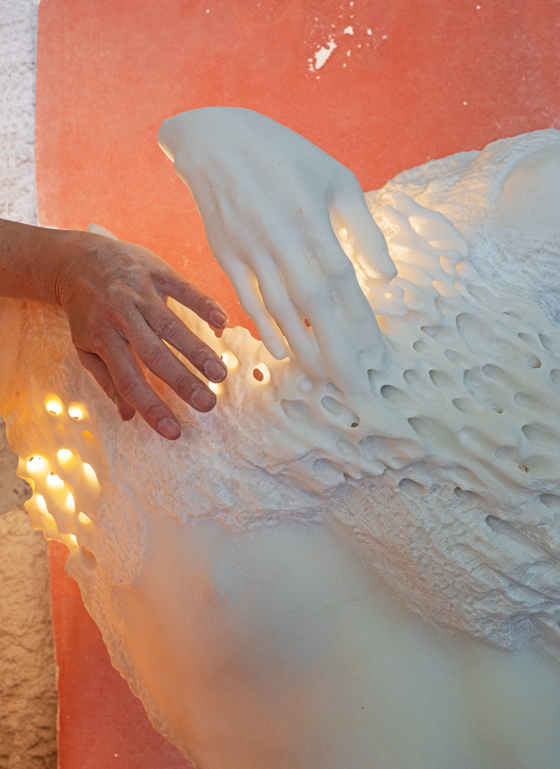 Marianna Blier, Cotton (work in progress), 2022, white Carrara marble, 150 (height) × 70 × 50 cm