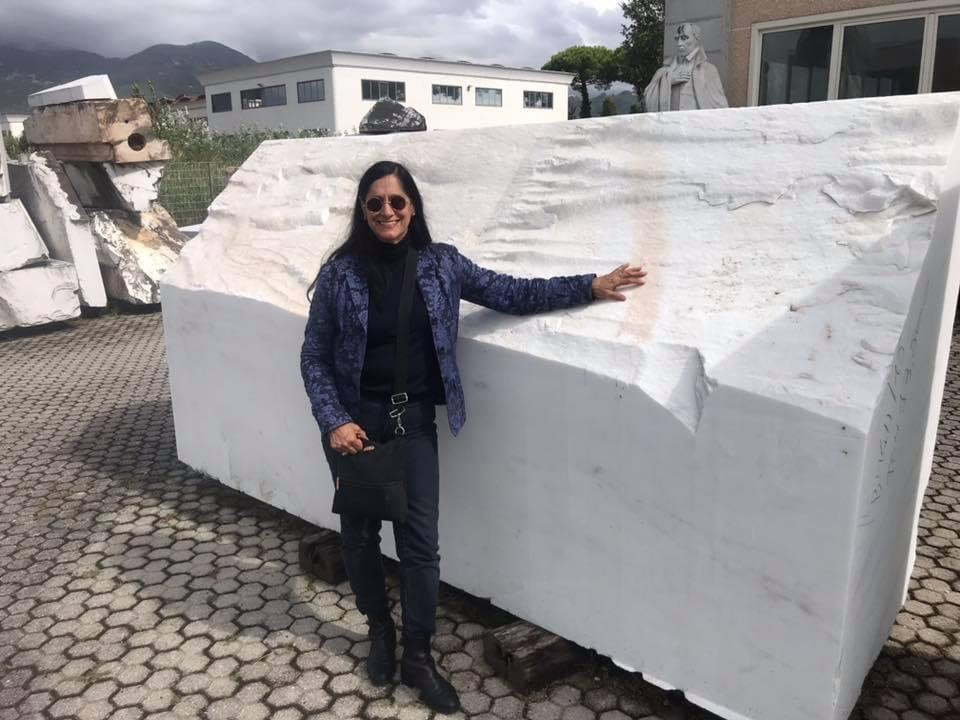 Nilda at Cervietti’s studios with the piece of statuario marble from Michelangelo’s cave