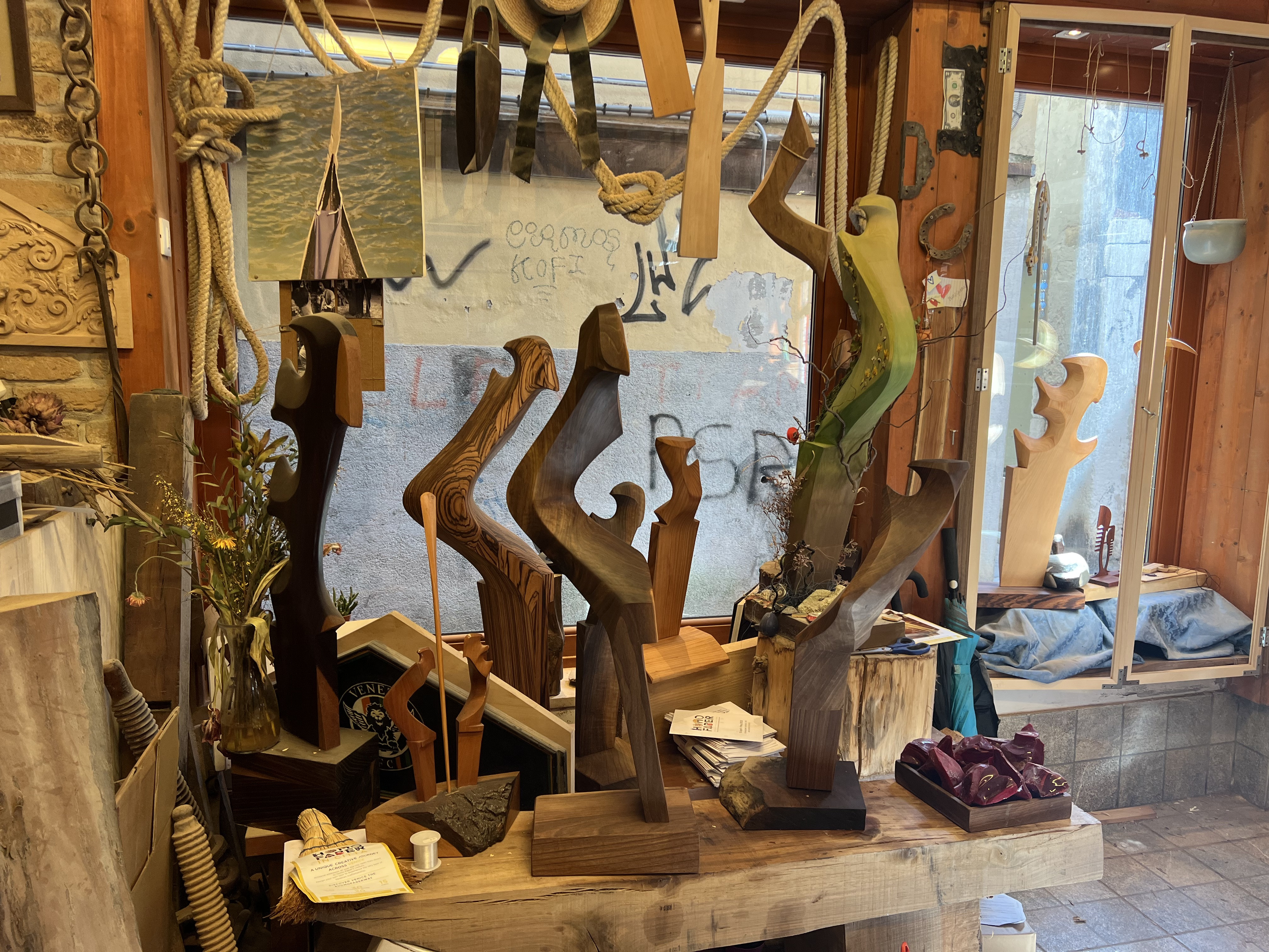In one window is a display of decorative forcolai, which hold their own as art objects in a variety of gorgeous woods. He speaks of a competition where he created a forcolai to express the natural beauty of the lagoon (see green and yellow forcolai below).