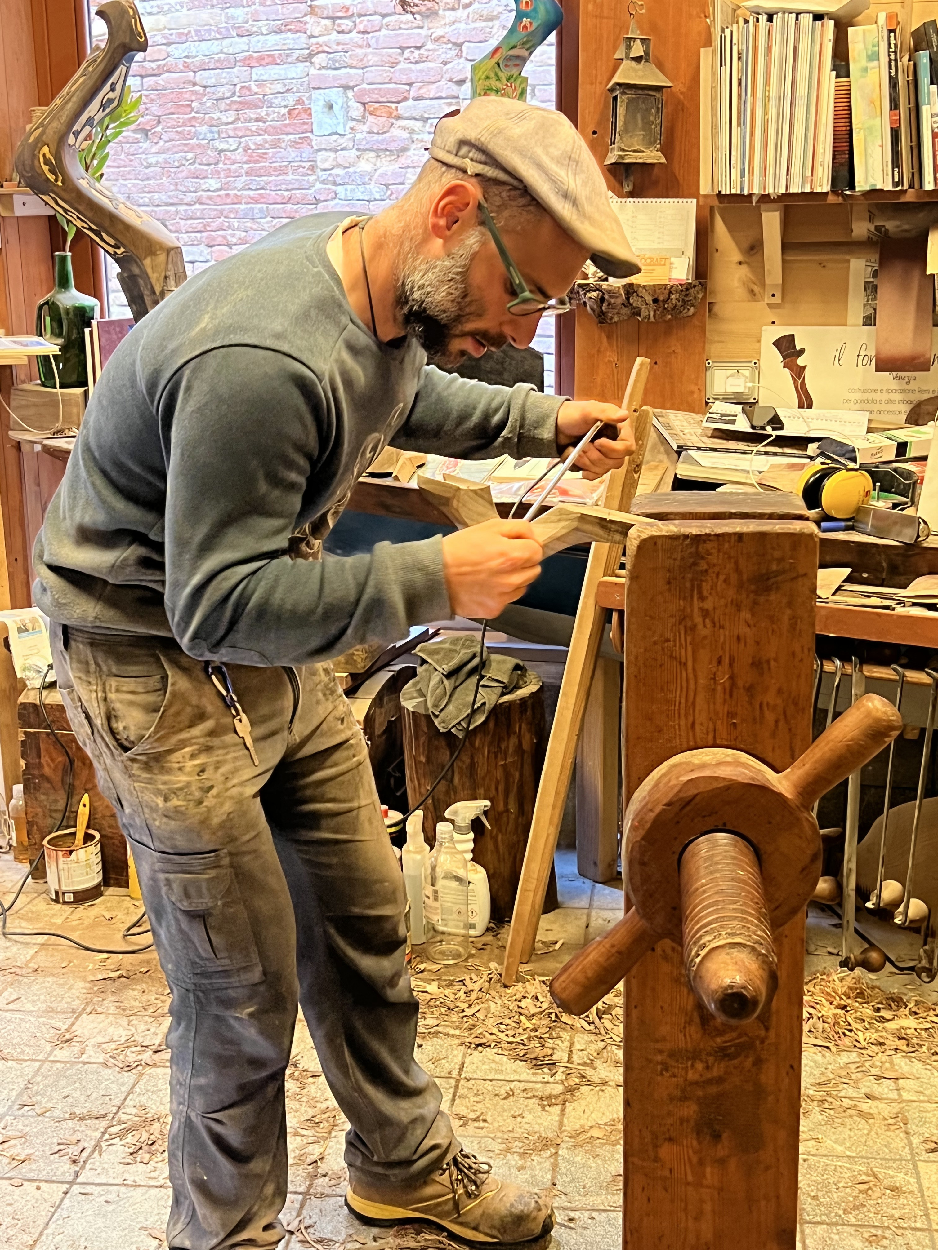Piero’s vibrant personality has earned him the name of the ‘mad forcolai maker’ and so his workshop is called ‘Il Forcolaio Matto.’ As we arrive, Piero is opening up his shop – hooking flower boxes onto his window sill, and leaning a striped oar against the wall.
