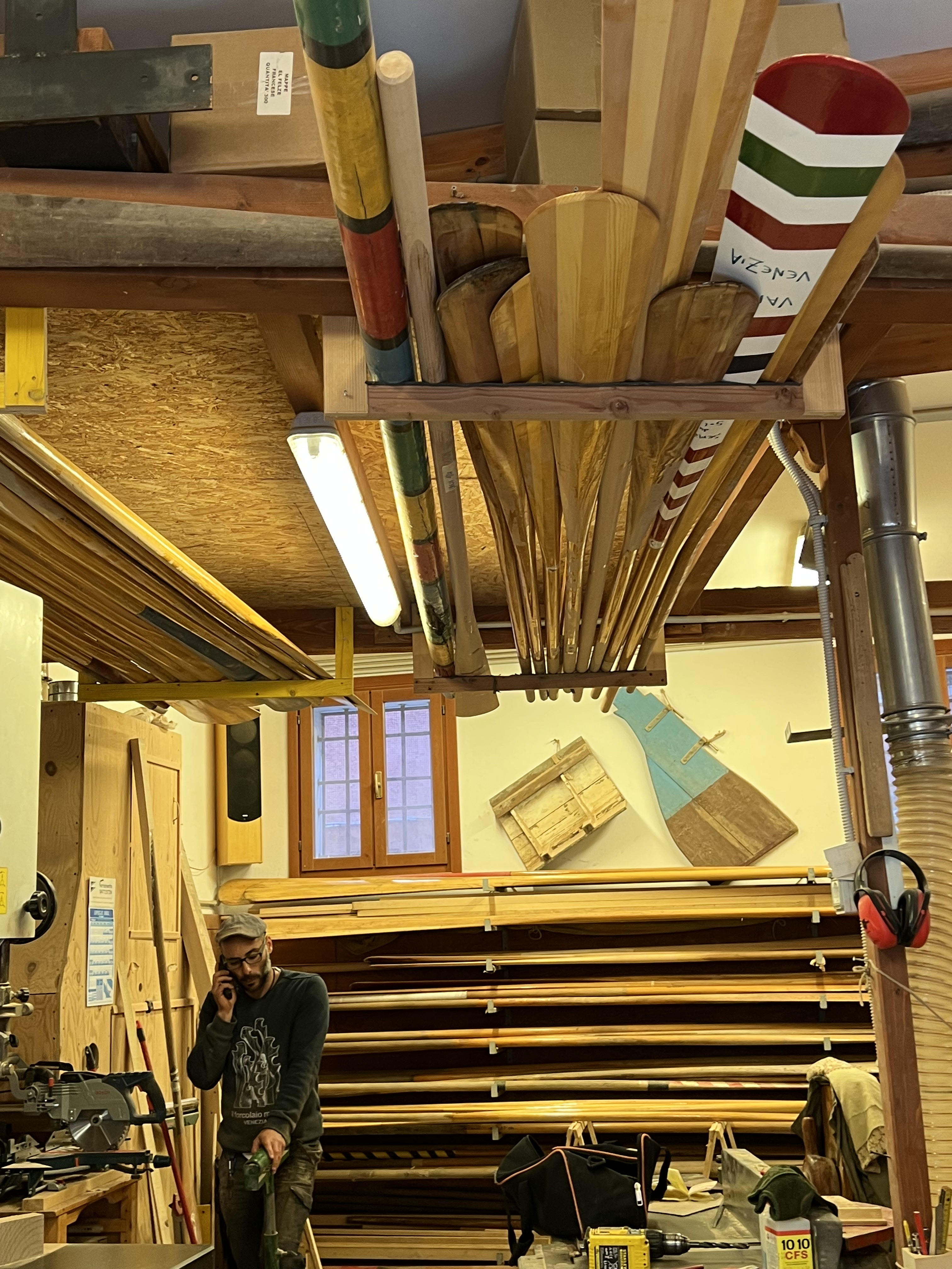 Piero’s workshops have painted and varnished oars suspended from the ceiling. He speaks about the different woods he uses and the boat community in Venice.